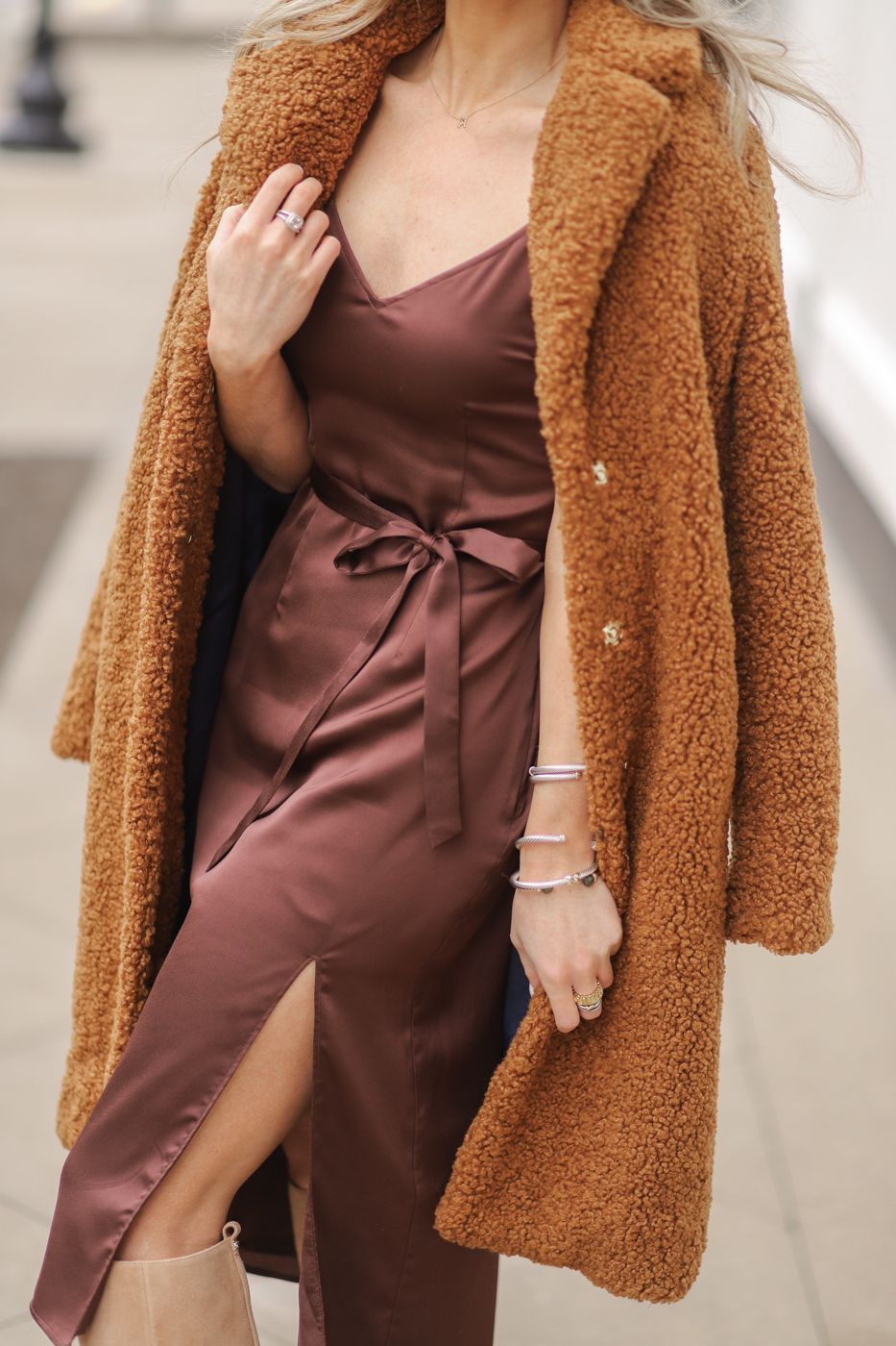 TIE-WAIST DRESS: Abercrombie (50% OFF! tts, xs) | TEDDY BEAR COAT: J.Crew (50% OFF! I sized down from xs to xxs) SWEATER: old but found THIS one similar |KNEE HIGH BOOTS: Sam Edelman | SUNGLASSES: Quay (teal 59mm) BAG: LV Neverfull GM
